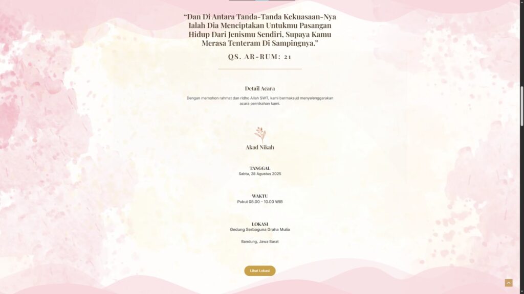 Setiap undangan digital pernikahan dibuat dengan gaya elegan dan bisa disesuaikan dengan tema cintamu.